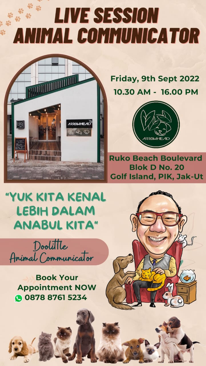 Offline Session with Doolittle Karmic Animal Communicator will be held on 23 July 2023 at 11.00 AM & 15.00 PM at Cluster Sutera Narada, Alam Sutera, Jakarta.