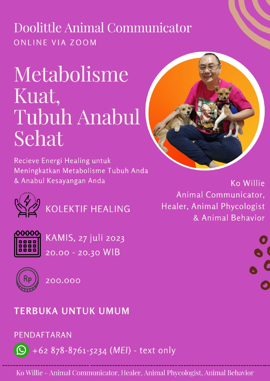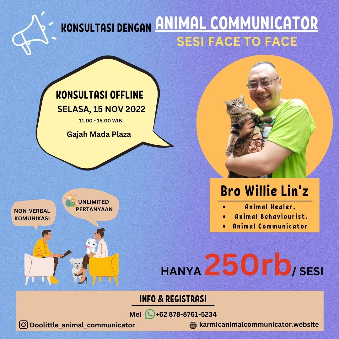 Offline Session with Doolittle Karmic Animal Communicator will be held on 15 November 2022 at 11.00 AM – 15.00 PM in Gajah Mada Plaza, Jakarta.
