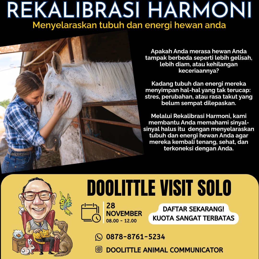 Offline Session with Doolittle Karmic Animal Communicator will be held on November 28th 2025 at 08.00 AM – 12.00 AM in Solo Equestrian Centre, Solo.